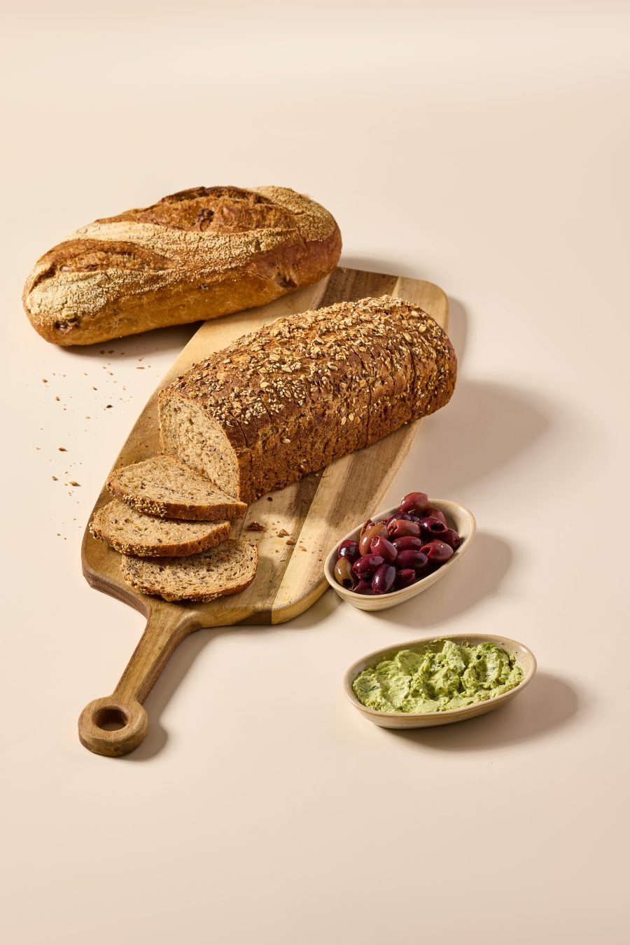שני לחמי מחמצת טבעית הנאפים במקום בליווי צנצנת זיתים.