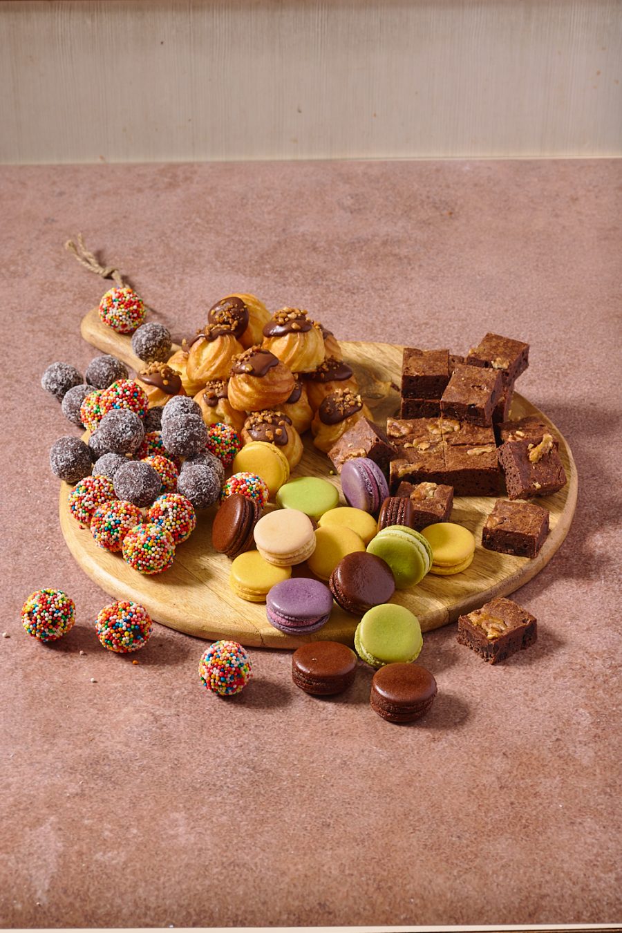 פחזניות במילוי קרם וניל ובציפוי גאנש שוקולד, מקרונים במבחר טעמים, קוביות בראוניז אגוזים וכדורי שוקולד קוקוס וסוכריות