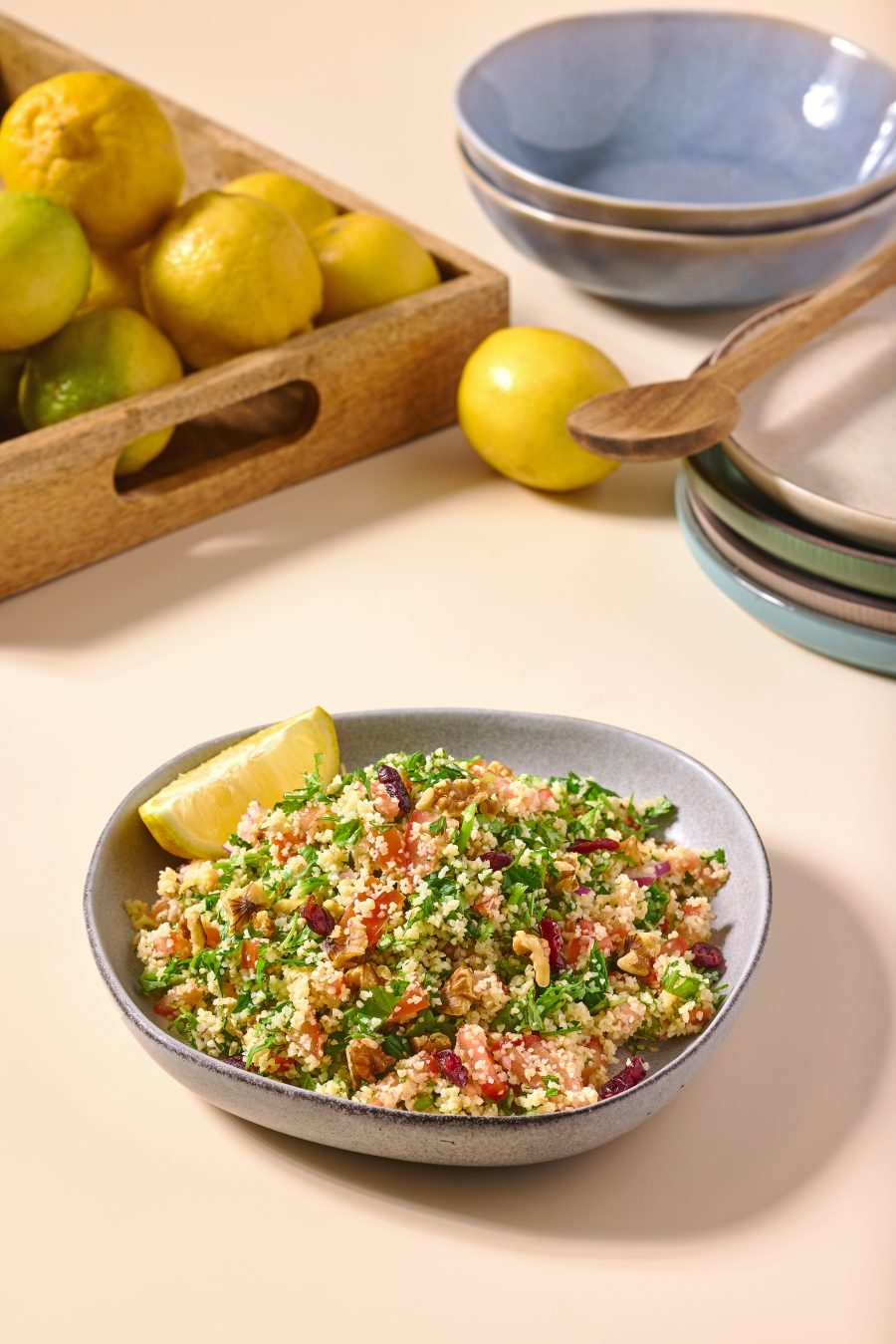בורגול, עגבניות, פטרוזליה, כוסברה, נענע, סלרי, בצל, אגוזי מלך וחמוציות בליווי וינגרט ביתי.