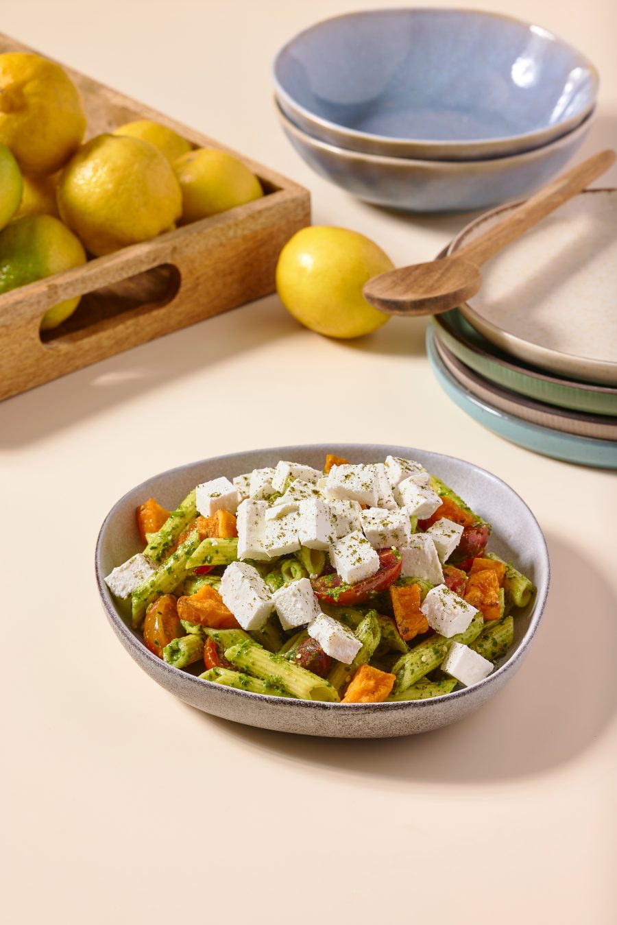 פסטה קצרה מתובלת בפסטו ביתי, עגבניות שרי, קוביות בטטה קלויה, זיתי קלמטה, קוביות פטה וסומק