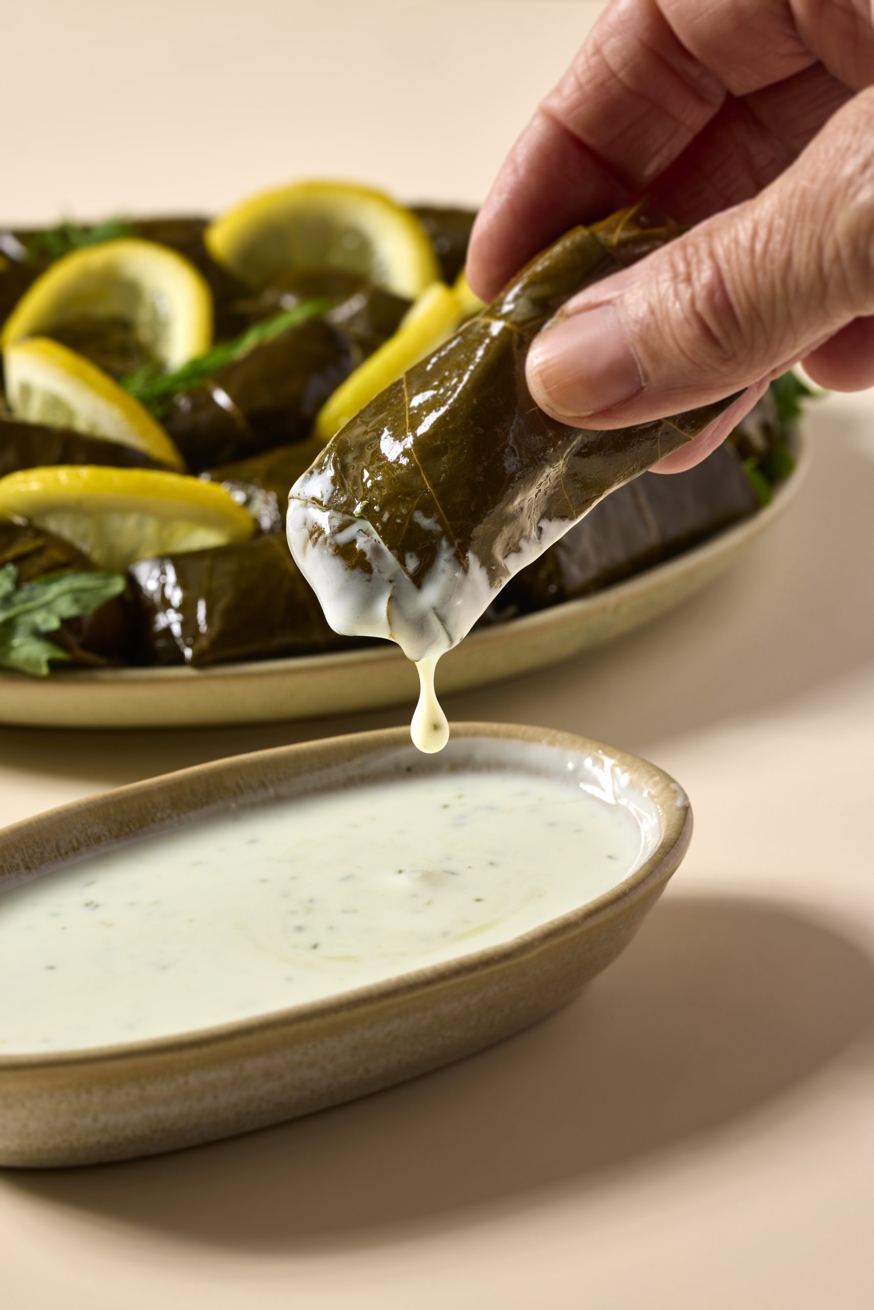 24 עלי גפן במילוי אורז מתובל, בליווי מטבל צזיקי רענן ולימונים טריים