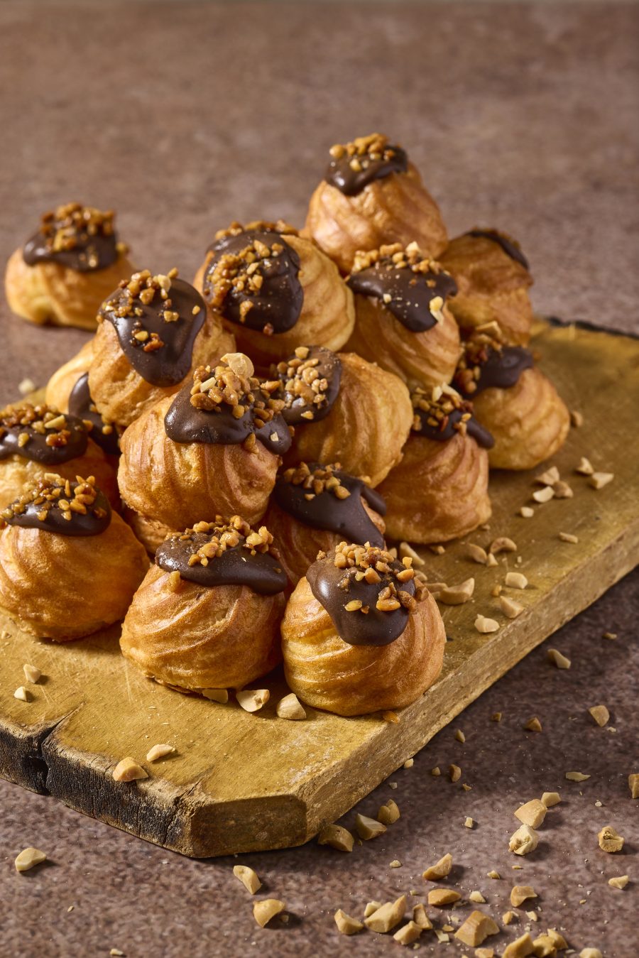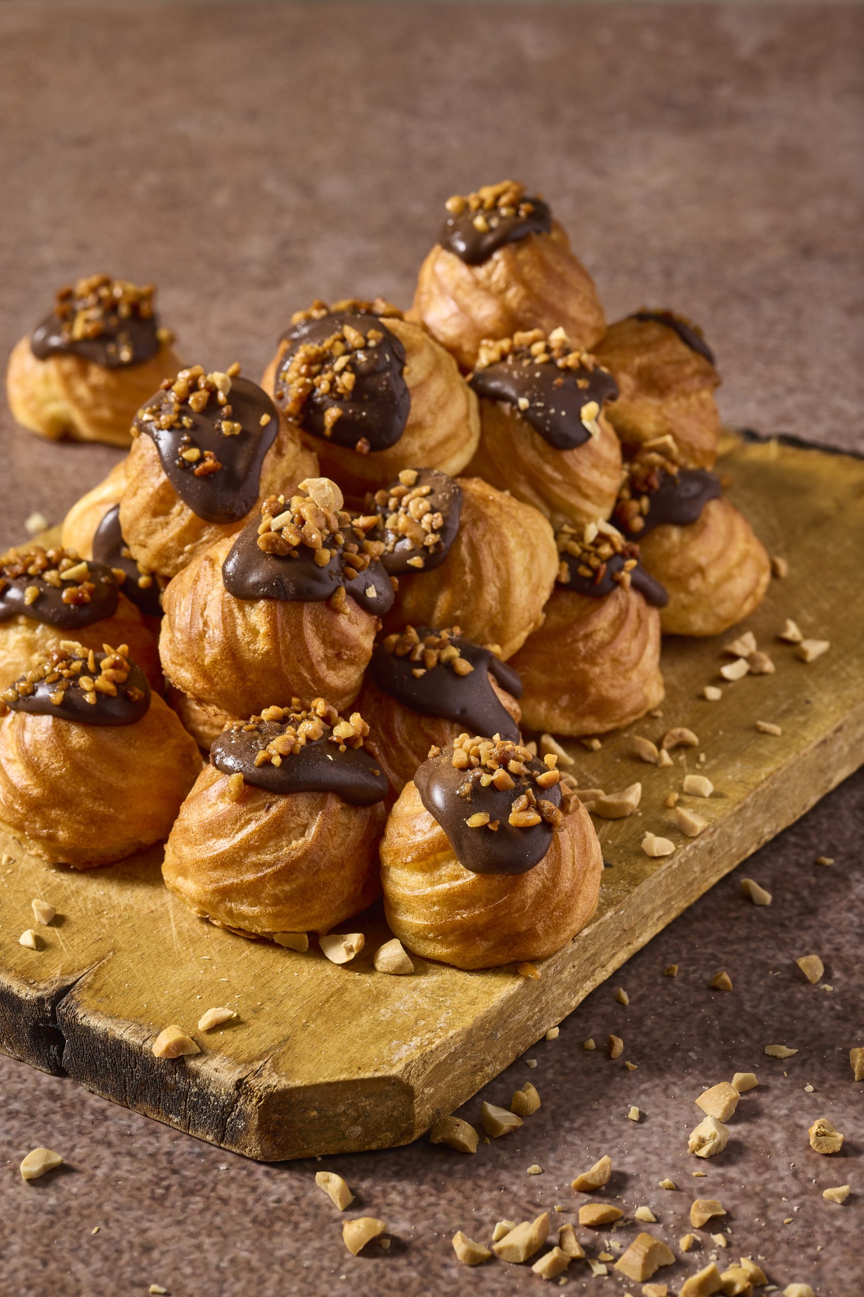 20 פחזניות במילוי קרם וניל, ציפוי שוקולד ושבבי בוטנים מקורמלים.