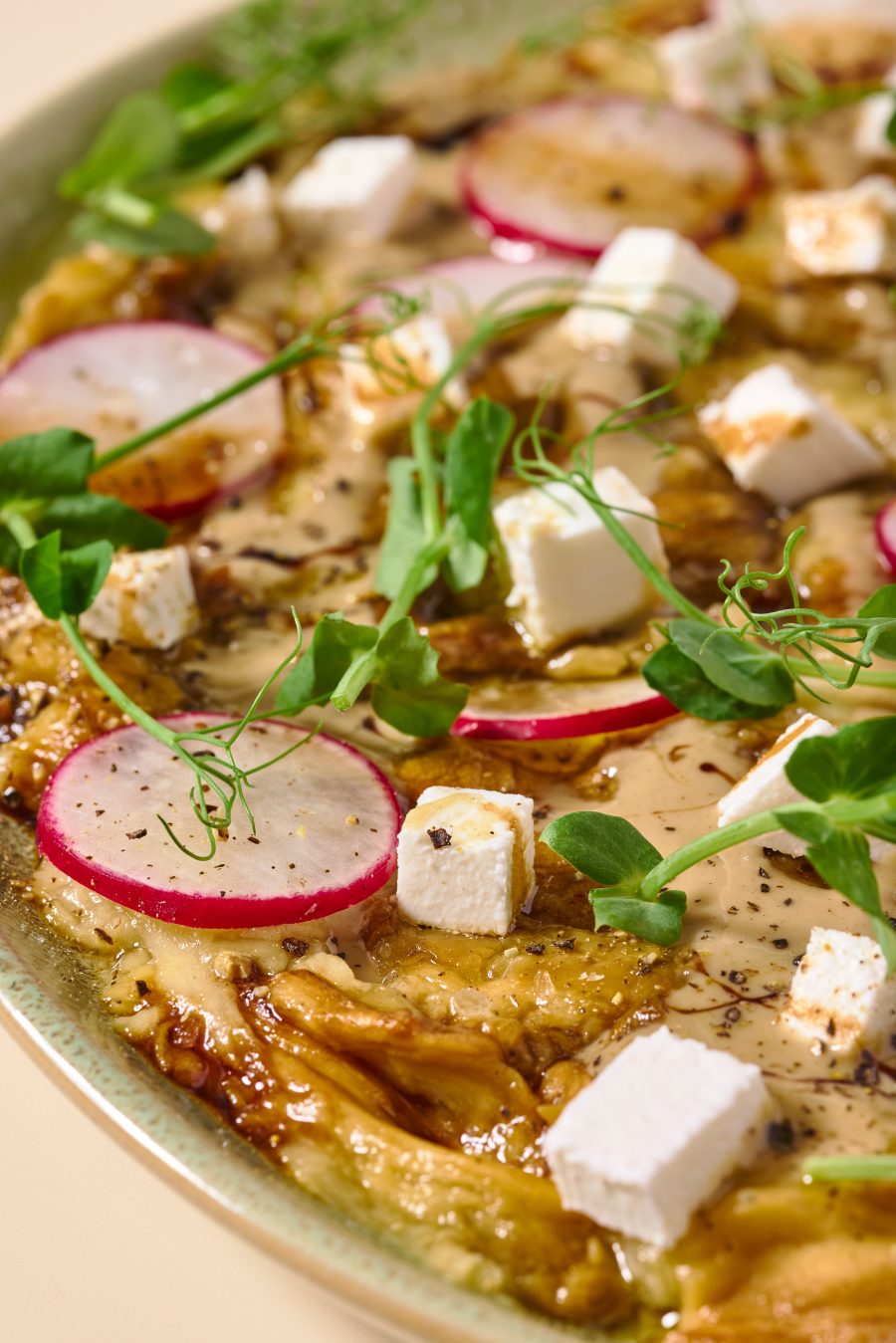 חציל קלוי, קוביות פטה, צנוניות, מיקרו בייבי, קרם בלסמי וטחינה